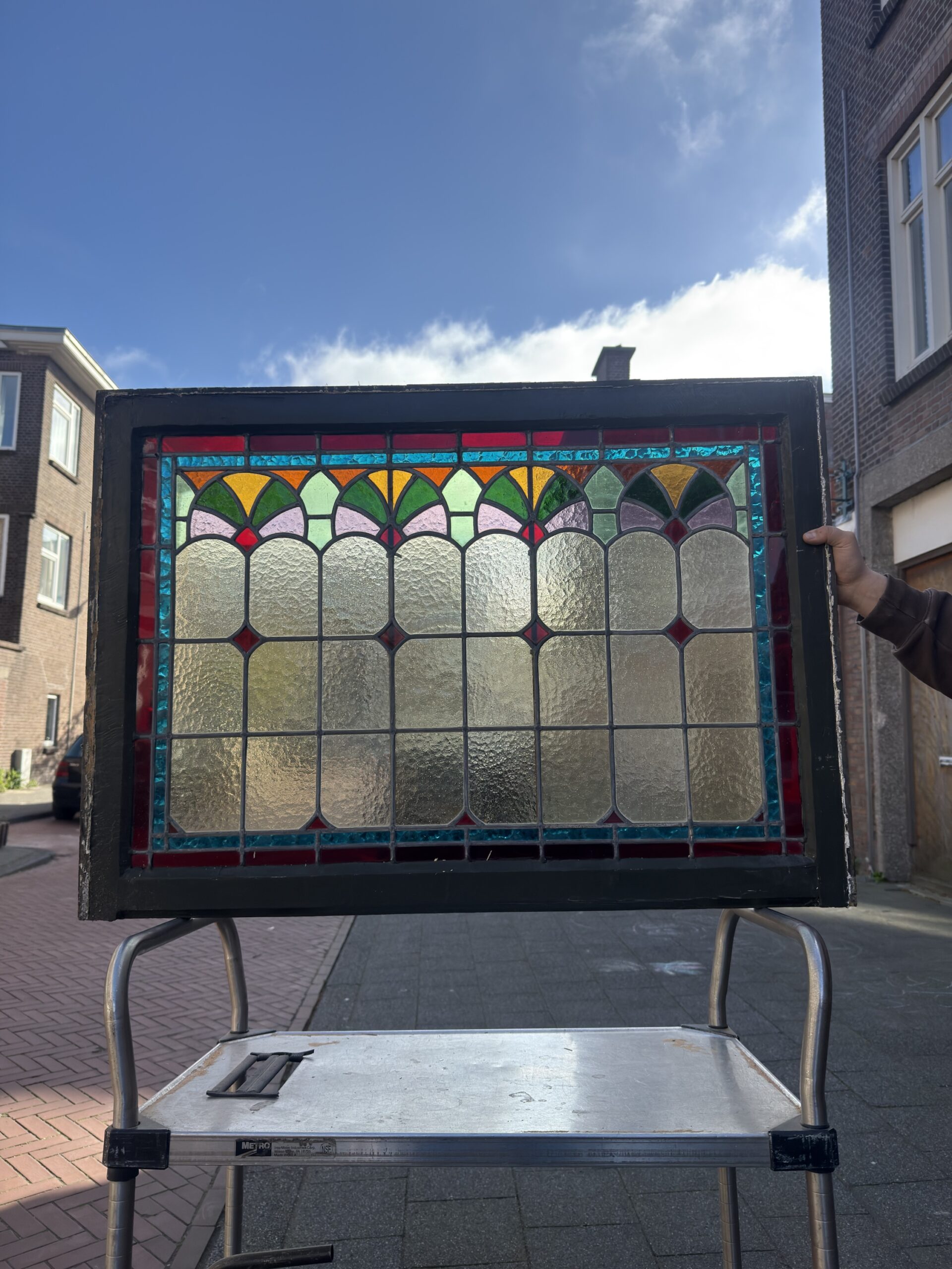 Kleur, ritme en vakmanschap in één raam. Dit glas-in-lood paneel heeft een compositie die direct opvalt: een rij sierlijke boogvormen in structuurglas, bekroond door waaierpatronen in geel, groen en lila, afgewisseld met rode ruitaccenten. Daarboven een brede band in turquoise en rood die het geheel strak omlijst. De zwart gelakte houten omlijsting maakt het paneel compleet en plaatsingsklaar.
