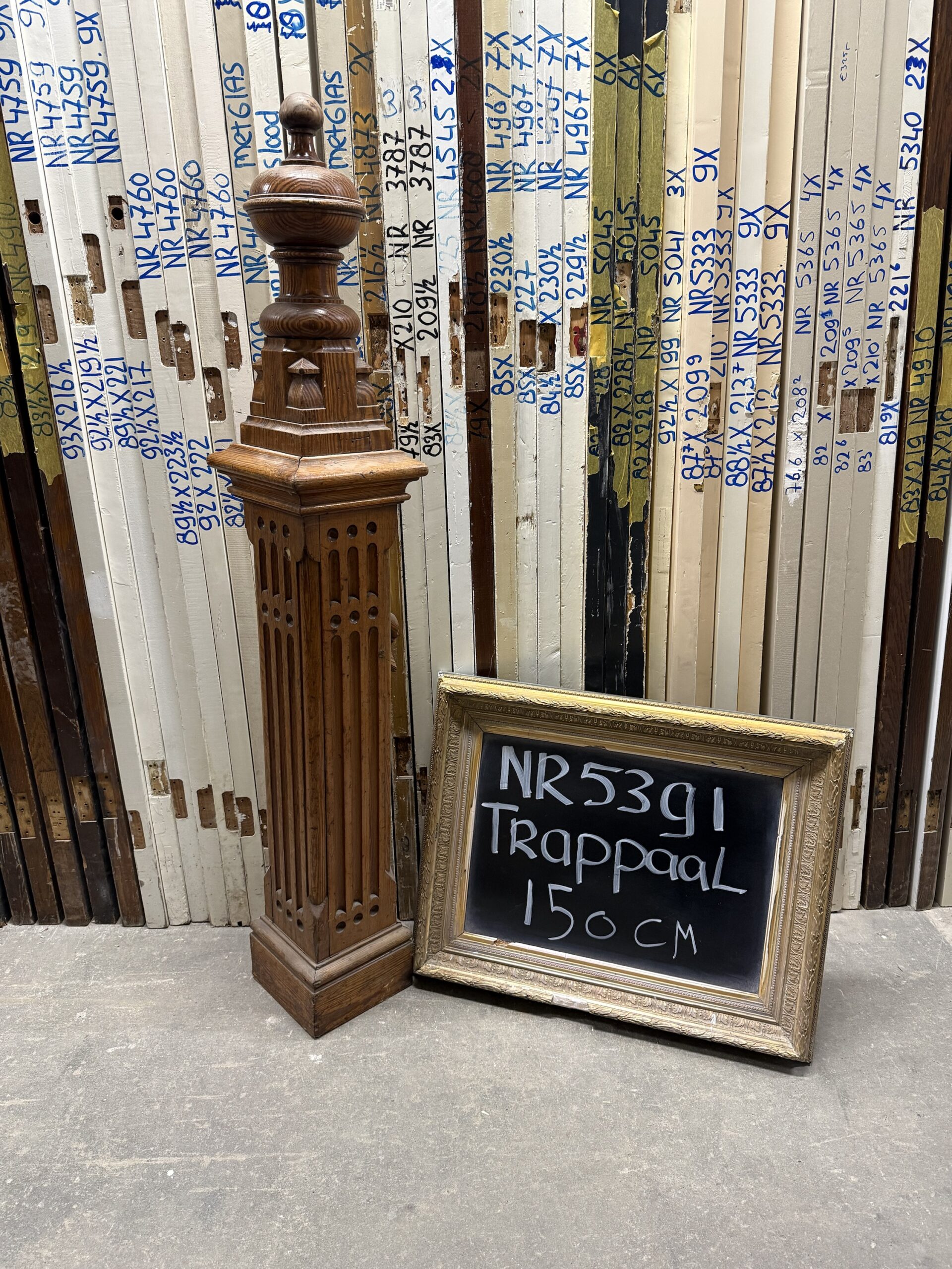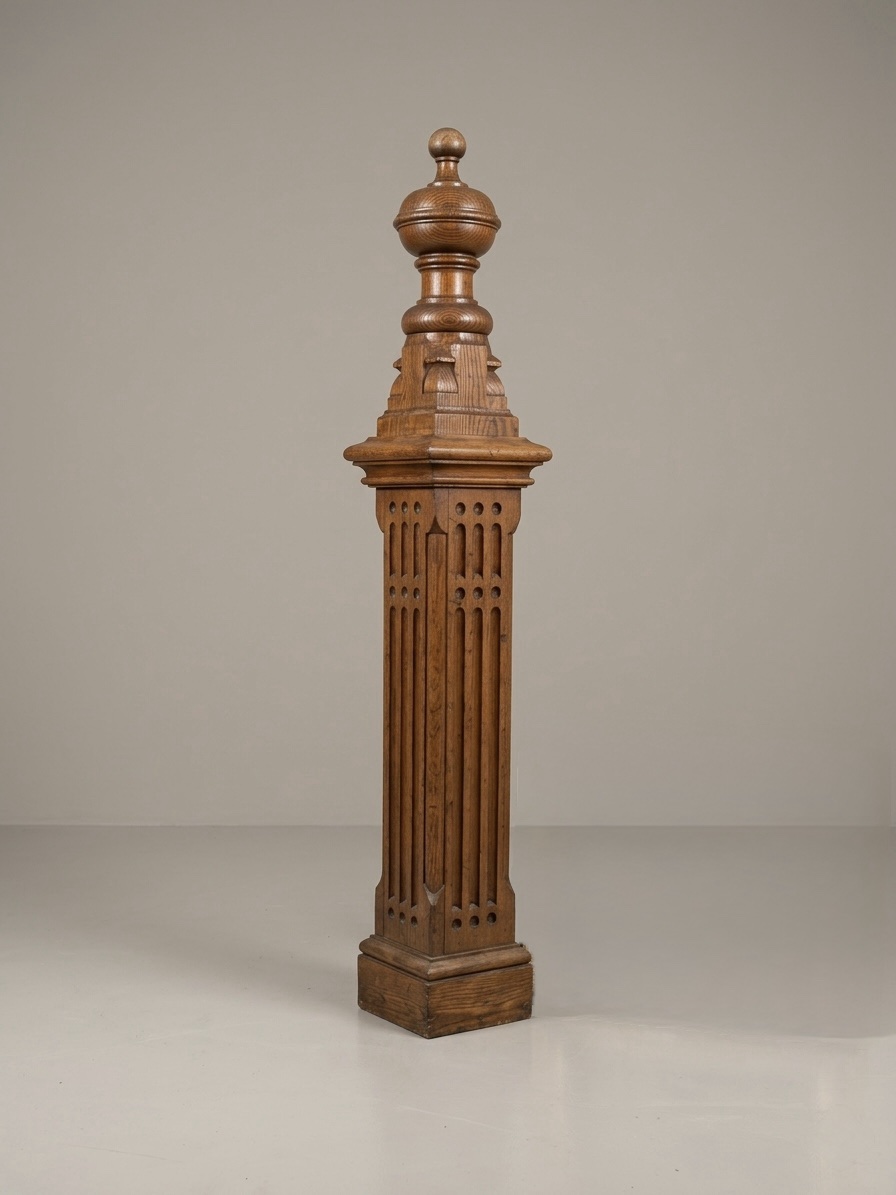 Een trappaal die direct de aandacht trekt. 150 cm hoog, vierkant van schacht, met langs alle zijden fijn uitgefreesd of gesneden sierwerk: smalle, spitsboogvormige uitsparingen met ronde openingen, een motief dat sterk doet denken aan gotische architectuur. De schacht rust op een solide vierkante voet en wordt bekroond door een gelaagd kapiteel met profileringen en een grote gedraaide bol als top.